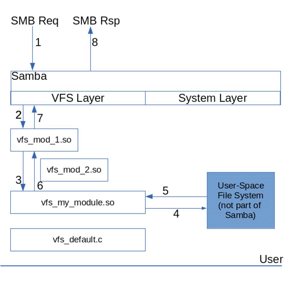 Samba VFS 는 원하는 기능을 제공하기 위해 Samba VFS 인터페이스가 제공하는 기능 중 일부 혹은 전부를 구현하는 공유 라이브러리, 모듈입니다. 또한 VFS 모듈은 스택형이 가능하고, 스택 상위에 구현되지 않은 기능에 대해 기본 Samba 기능을 제공하는 vfs\_default.c 가 있습니다.